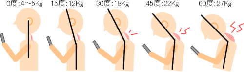 下のイラストの左側ように姿勢を少しでも意識すれば、首や肩にかかる負担は抑制できます。