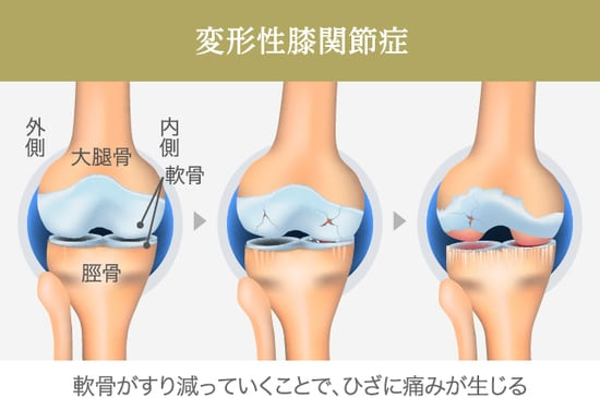ひざ関節の軟骨がすり減ることで、ひざに痛みが生じる進行性の疾患です。主な原因は加齢で、一般的には60~70歳代にかけて発症する方が増えてきますが、過去にひざの怪我などをしている場合は、若いうちから痛みを感じ始める方もいらっしゃいます。日本人の骨格はO脚の傾向が強く見られるため、内側型の変形性膝関節症を呈することで、ひざの内側に痛みを感じます。