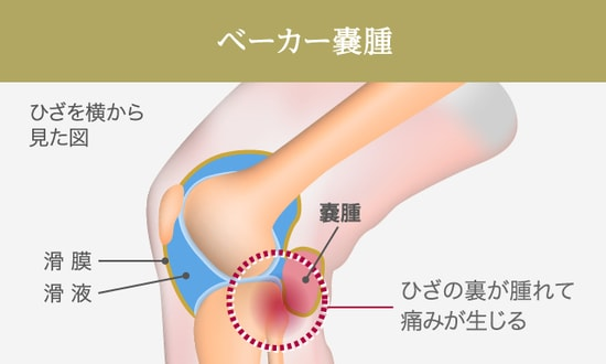 ひざの裏にある関節液(滑液)を含んだ滑液包が炎症を起こし、膨らむ疾患です。過剰な摩擦や圧迫が加わると炎症が起こり、圧迫感や痛み、腫れなどが生じます。悪性の腫瘤ではありません。
