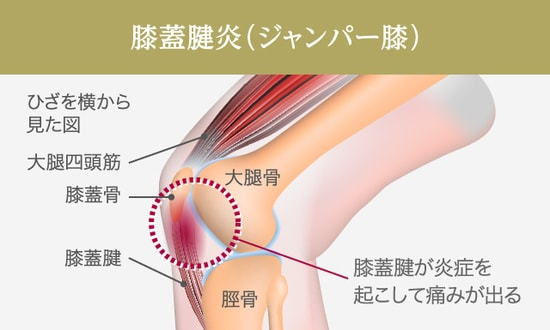 ひざへの負荷が繰り返されることによって、ひざのお皿(膝蓋骨)とすねの骨(脛骨)の間にある膝蓋腱(しつがいけん)が炎症を起こし痛みが出ます。ジャンプなどのひざに負担がかかる動作によって発症することから、「ジャンパー膝」とも呼ばれています。