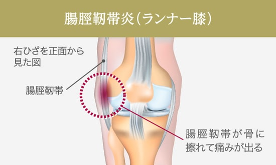 ひざへの負荷が繰り返されることによって、ひざの外側にある腸脛靭帯(ちょうけいじんたい)が骨に擦れて痛みが出ます。スポーツ(マラソン、水泳、バスケット、バレーなど)や、長距離を歩いたり重量物を運搬する仕事など、ひざへ繰り返し負荷がかかるに動作が多い方に起こる可能性があります。