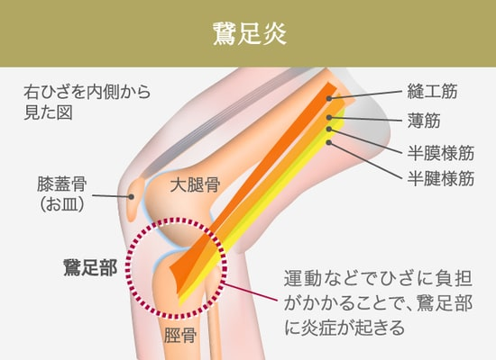 「鵞足」は脛骨というスネの骨の内側に位置し、ひざの曲げ伸ばしに関係する複数の筋肉がついている部位で、この部位で起こる炎症が鵞足炎です。運動前のストレッチを怠ることや過度なランニングなどによってひざに負担がかかることで発症します。